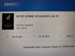 ‚In die Sonne schauen‘ wurde im Rahmen der Internationalen Filmfestspiele in Cannes im Mai 2025 uraufgeführt und erhielt den Preis der Jury. Als deutscher Vorschlag wurde der Film für die Kategorie ‚Bester Internationaler Film‘ für die Oscarverleihung 2026 ausgewählt. Meiner Einschätzung nach zu Recht, ein Film, der bei mir viele Fragen aufgeworfen hat und mir noch lange nachgegangen ist.